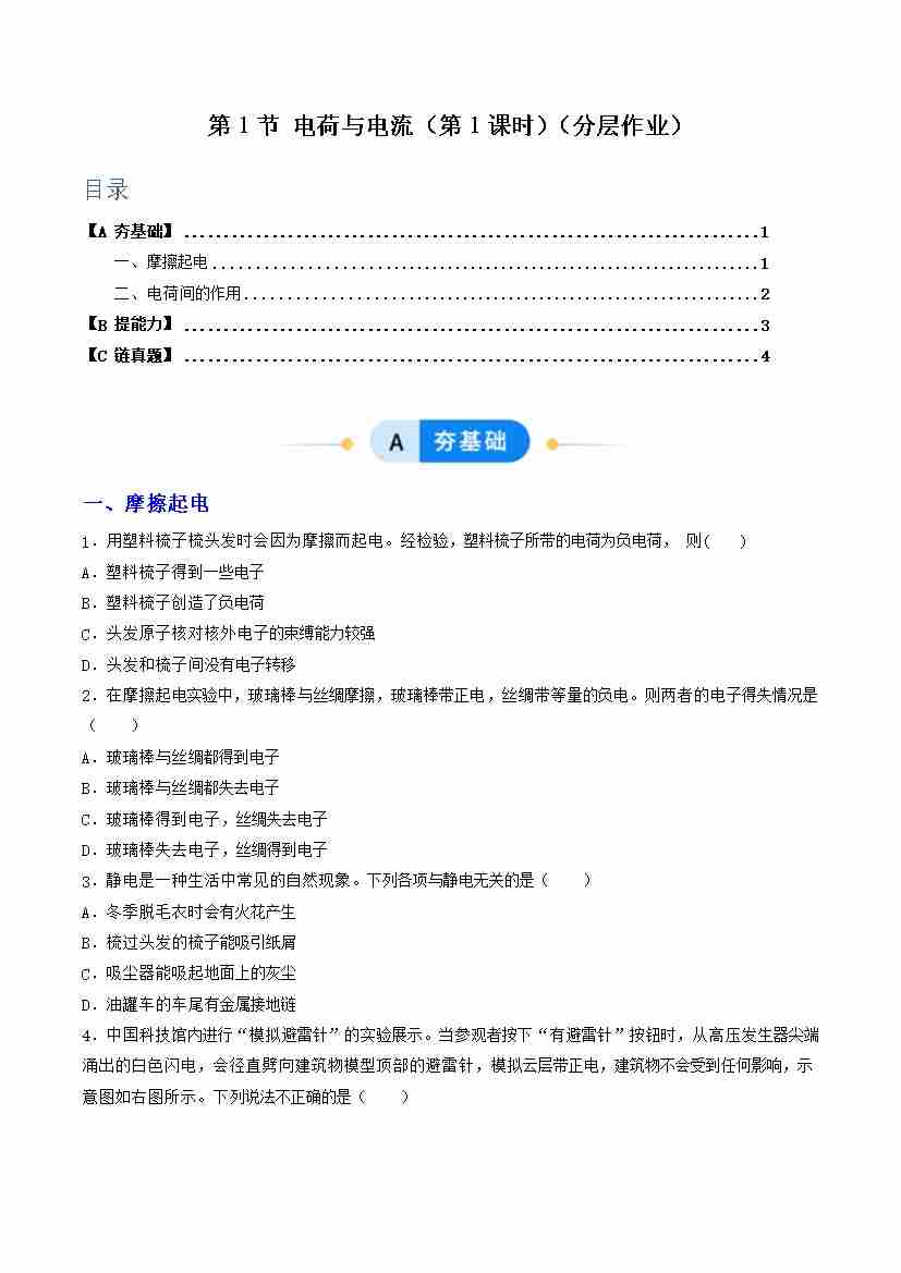 第1节 电荷与电流 第1课时(分层作业)(原卷版)科学浙教版2024八年级上册