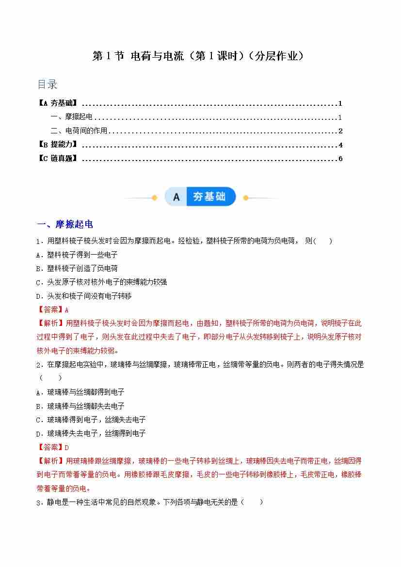 第1节 电荷与电流 第1课时(分层作业)(解析版)科学浙教版2024八年级上册