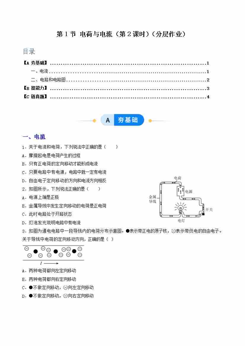 第1节 电荷与电流 第2课时(分层作业)(原卷版)科学浙教版2024八年级上册