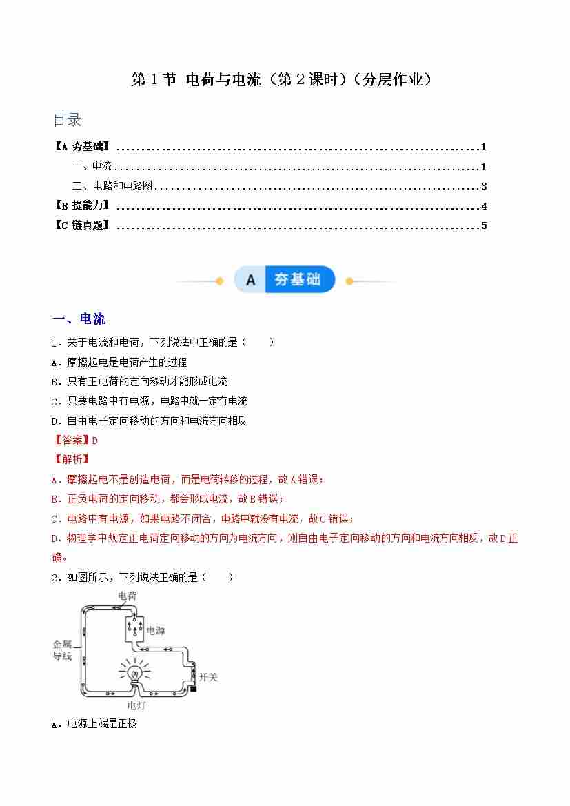 第1节 电荷与电流 第2课时(分层作业)(解析版)科学浙教版2024八年级上册