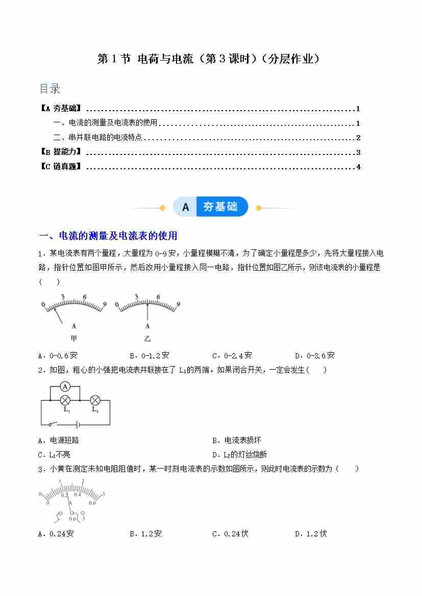 第1节 电荷与电流 第3课时(分层作业)(原卷版)科学浙教版2024八年级上册