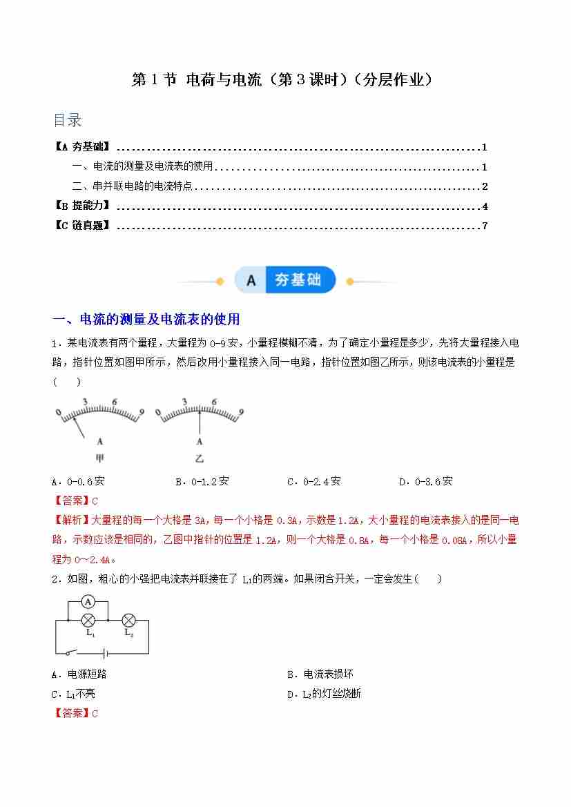 第1节 电荷与电流 第3课时(分层作业)(解析版)科学浙教版2024八年级上册