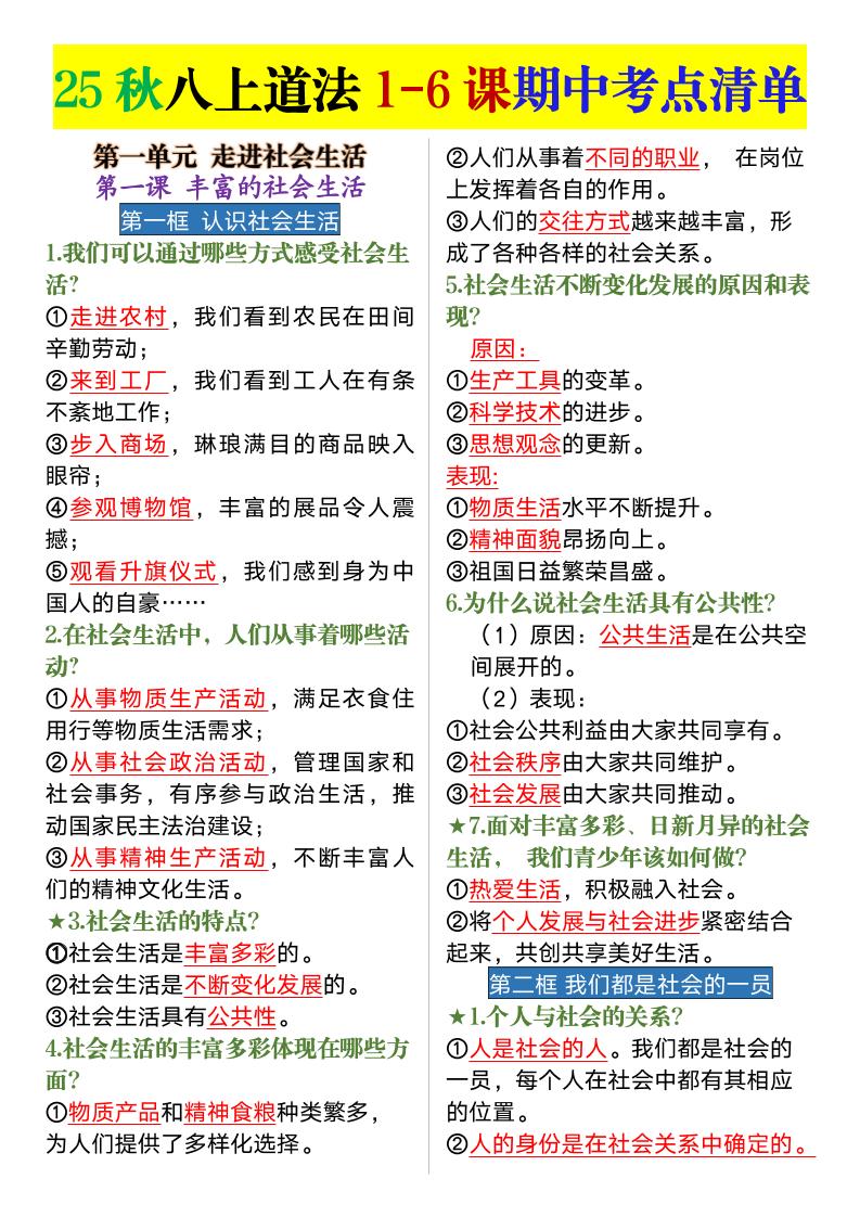 25秋八上道法1-6课期中考点清单(1)22