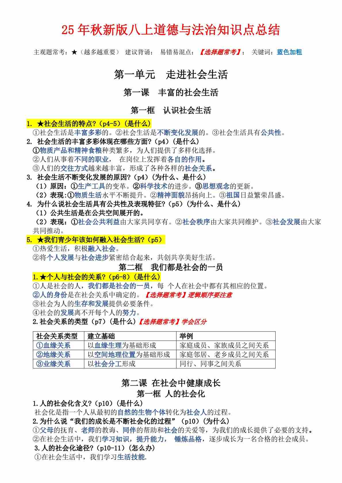 (标重点页码)25年新版八上道法知识点总结Word