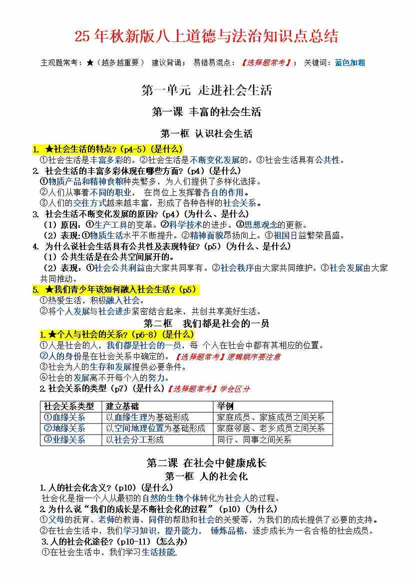 (标重点页码)25年新版八上道法知识点总结