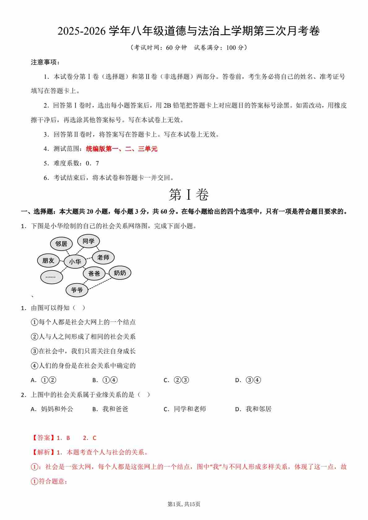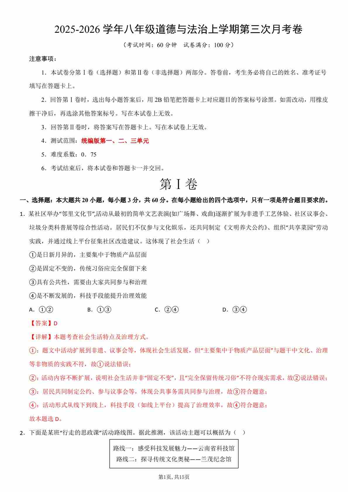 八年级道德与法治第一次月考卷01(考试版)(统编版2024)