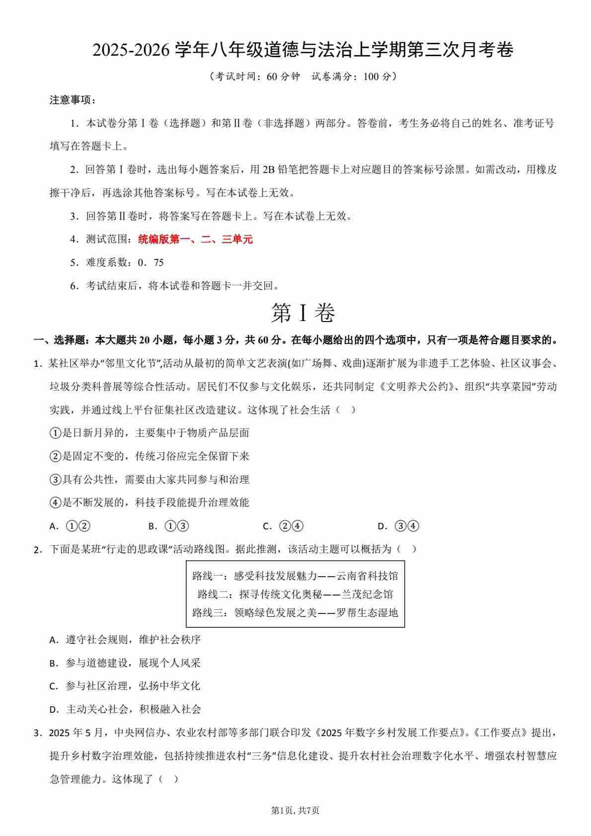 八年级道德与法治第三次月考卷01(考试版)(新教材统编版)