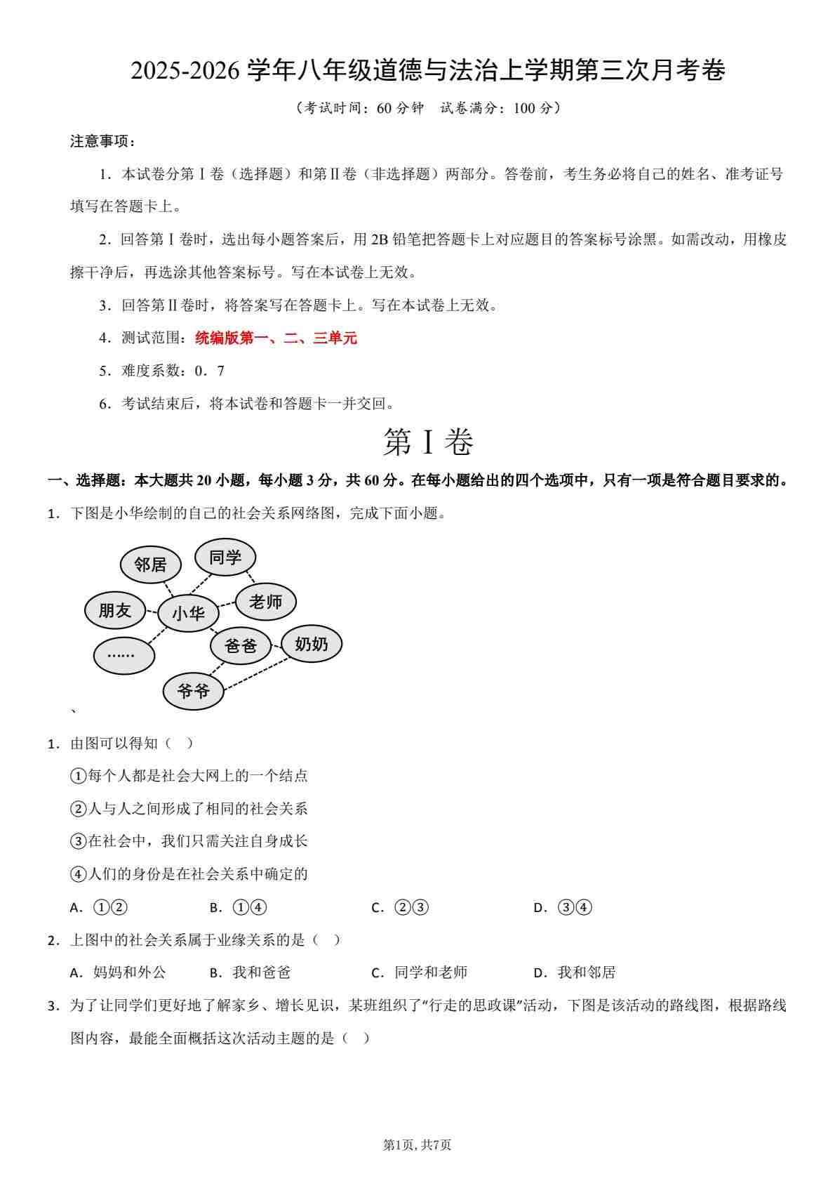 八年级道德与法治第一次月考卷02(考试版)【测试范围:第一单元】(统编版2024)