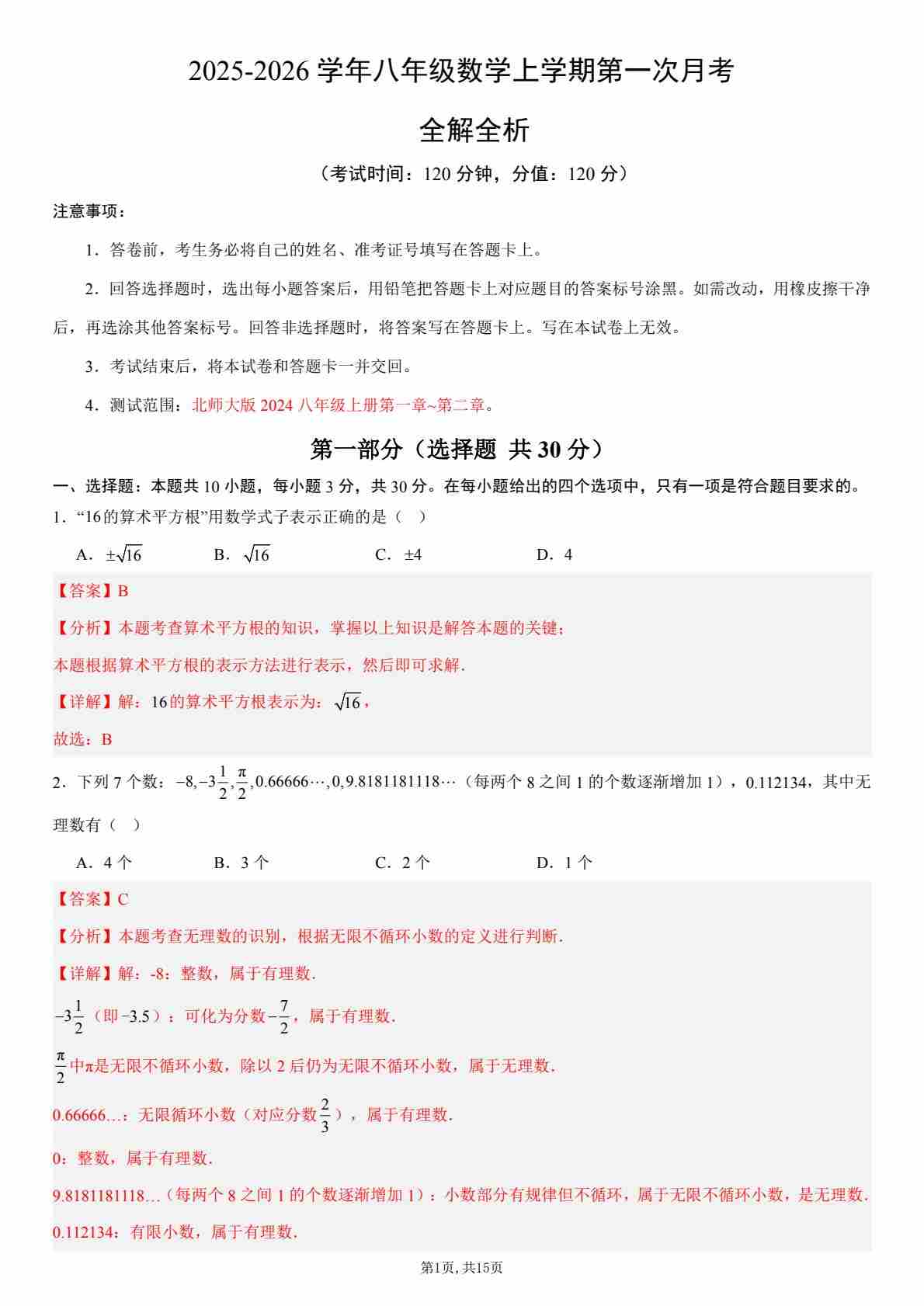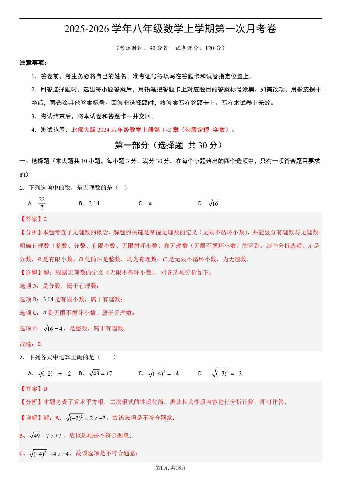 (北师版)八年级数学上学期第一次月考02(全解全析)(北师大版2024)