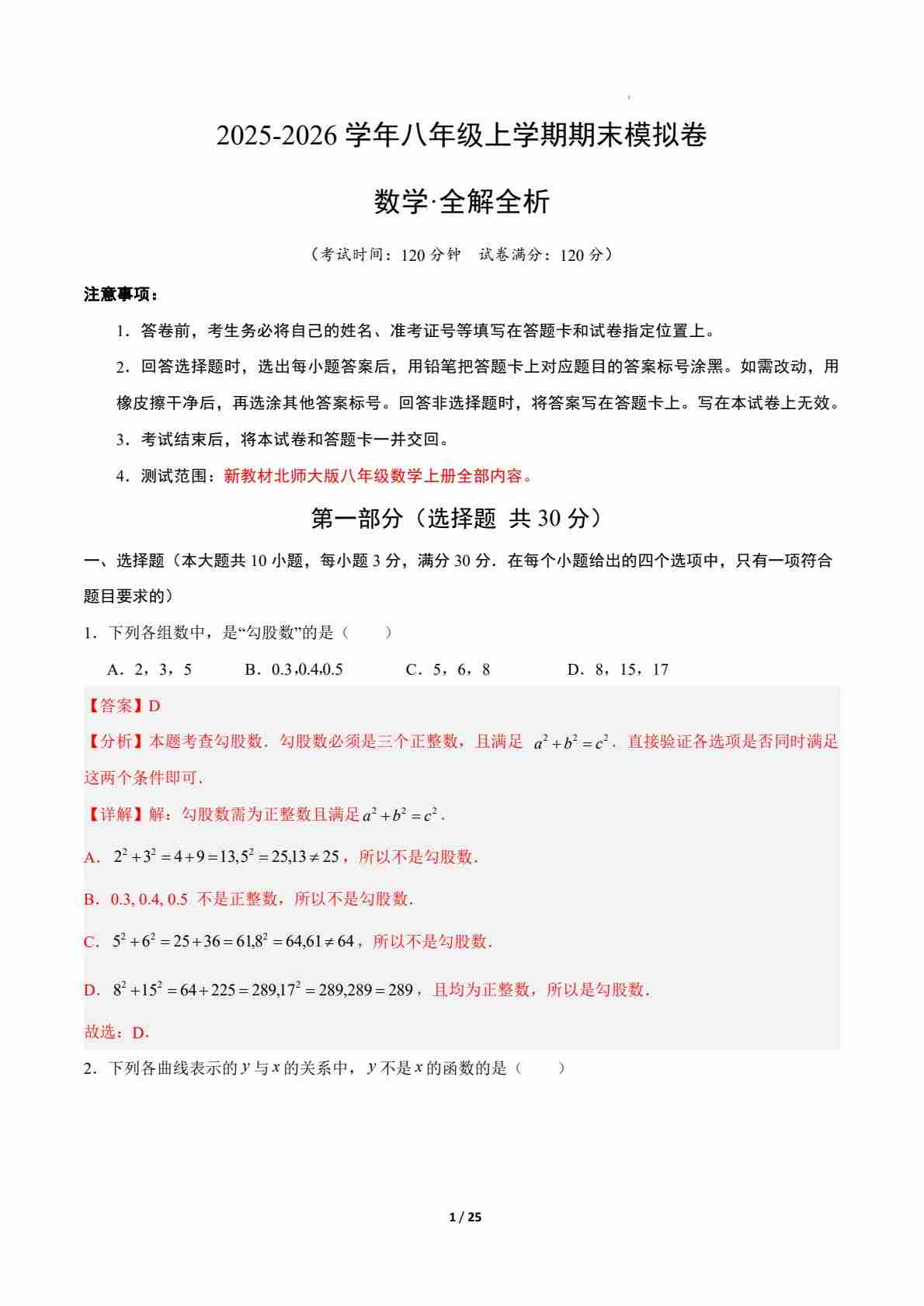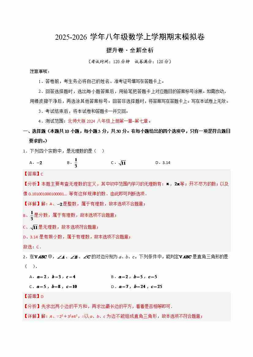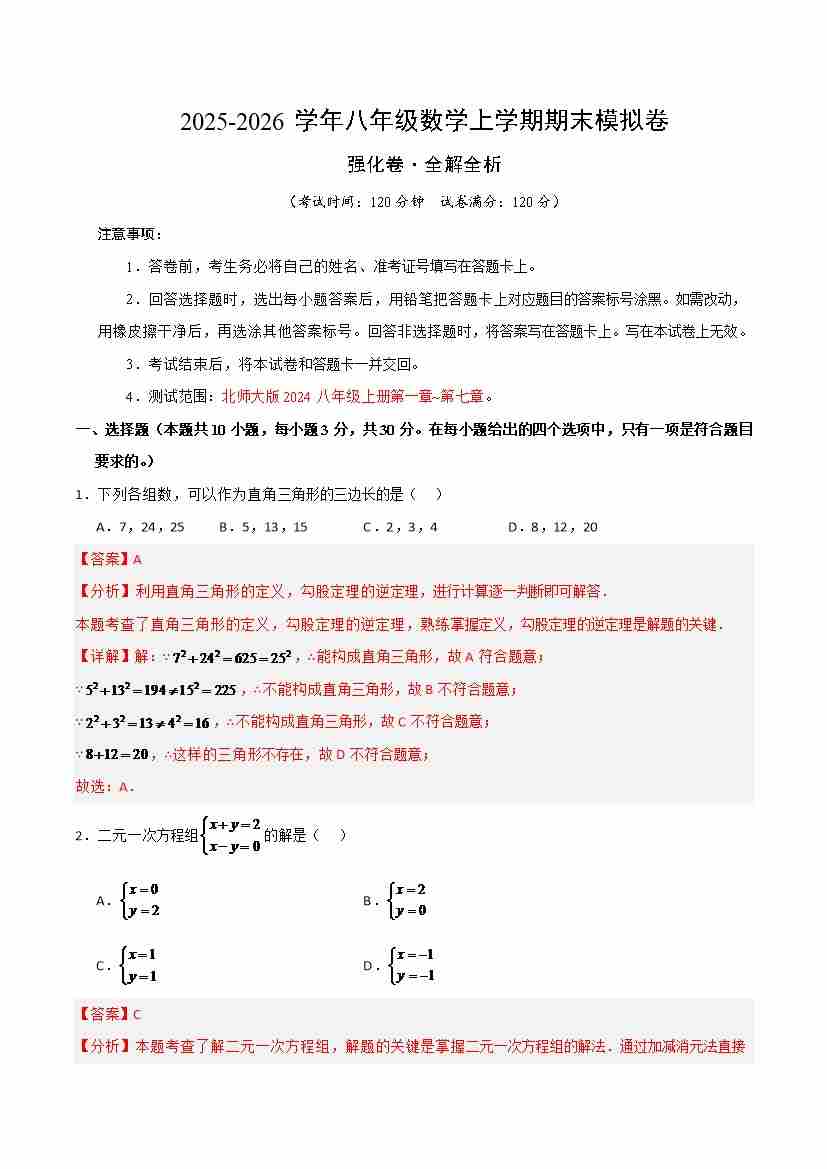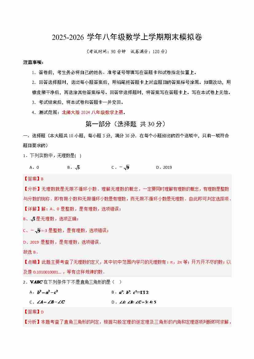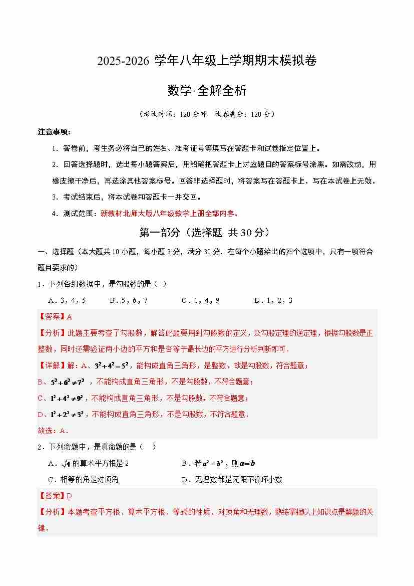 八年级数学上学期期末模拟卷·拔尖卷(北师大版,举一反三)(解析版)