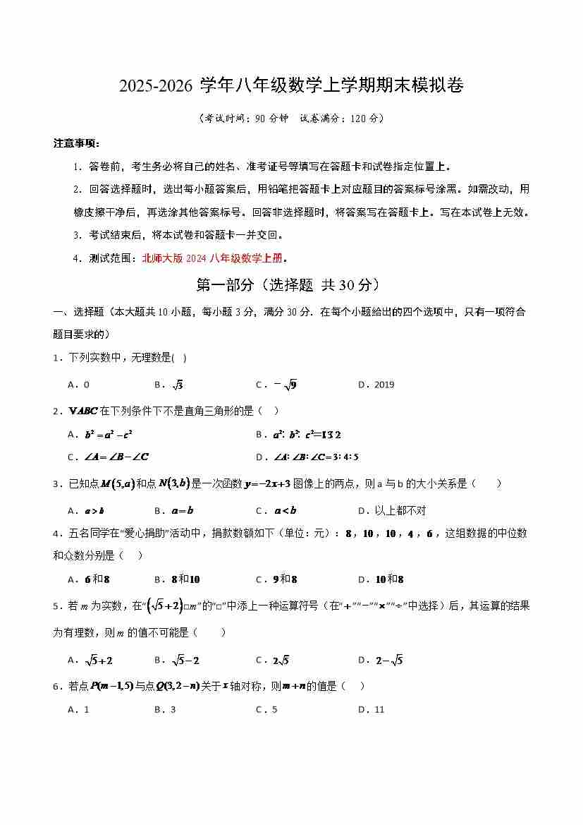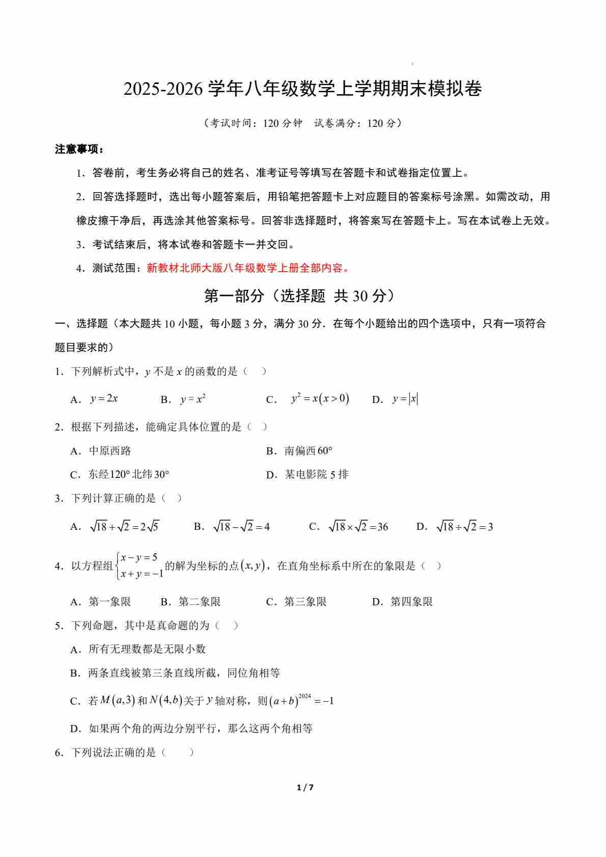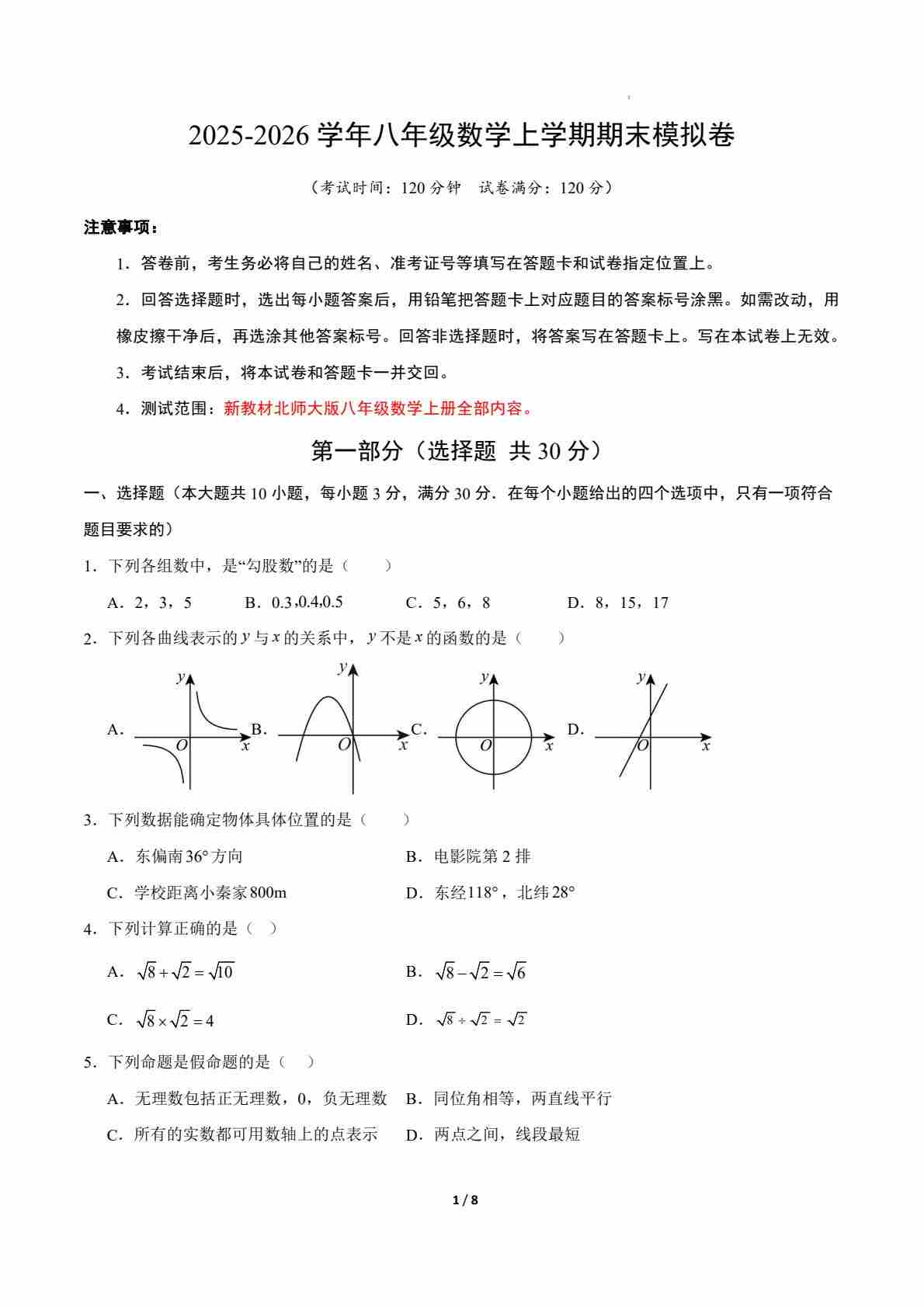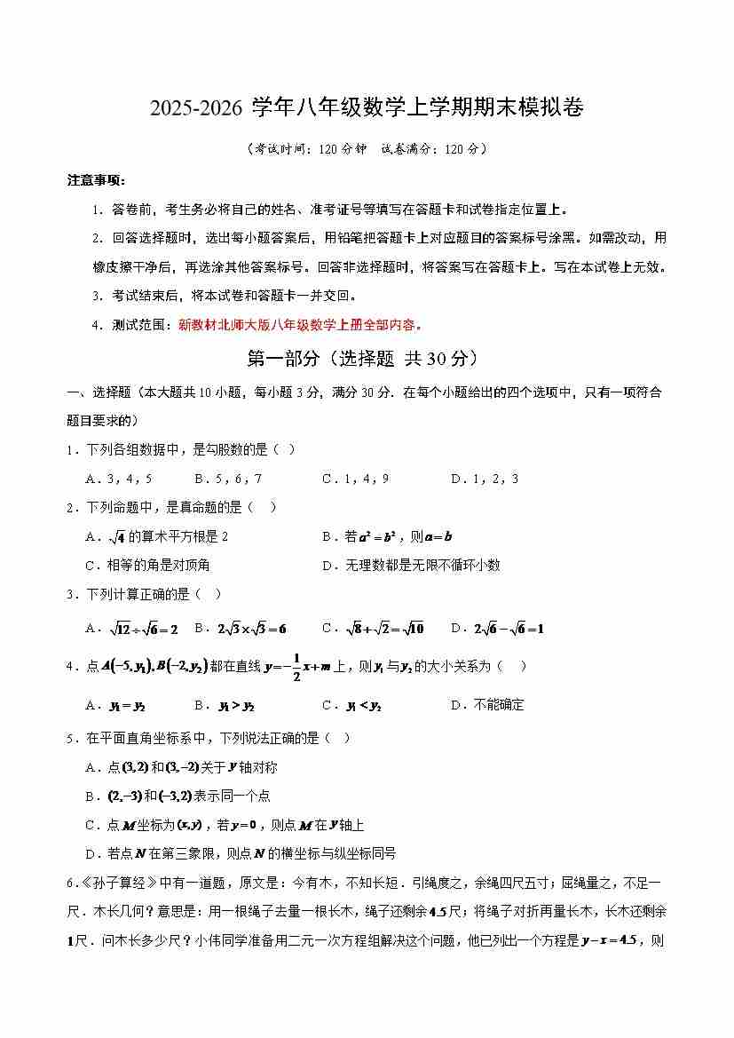 八年级数学上学期期末模拟卷(测试范围:新教材北师大版)(考试版A4)
