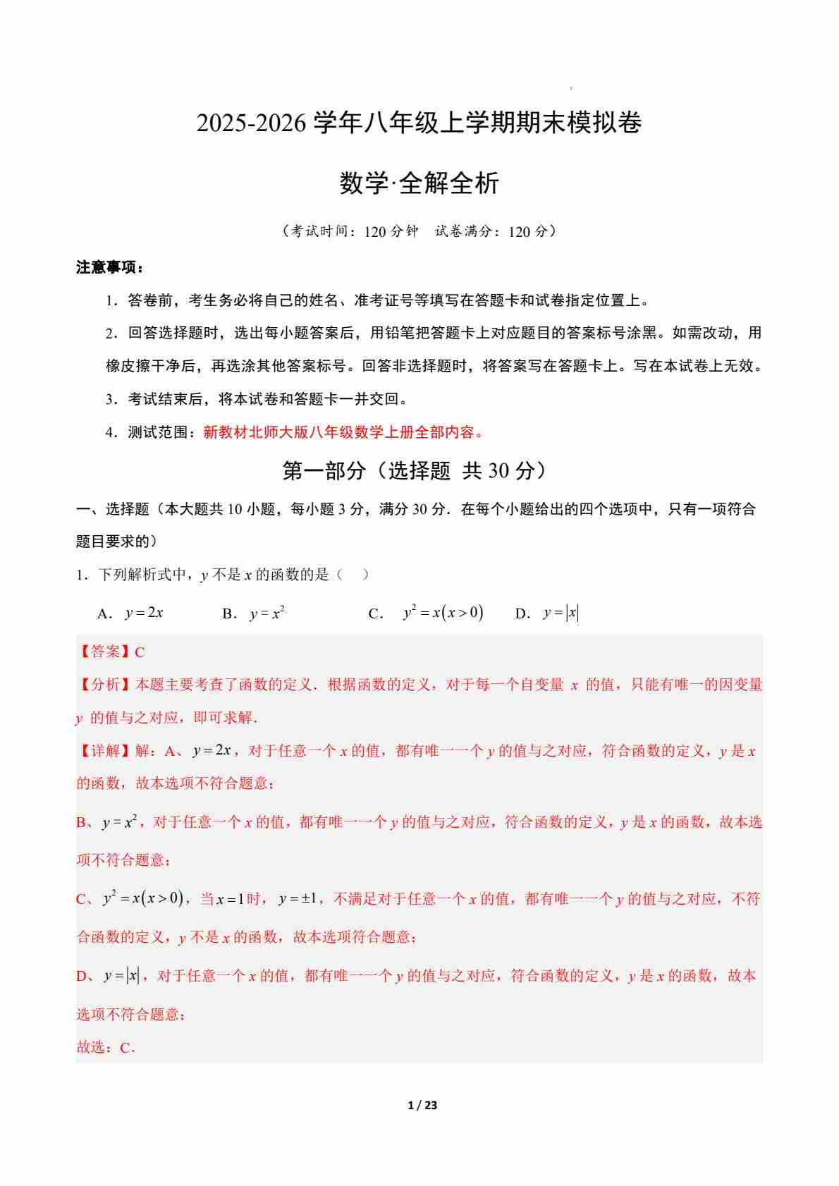 八年级数学上学期期末模拟卷(全解全析)(新教材北师大版)