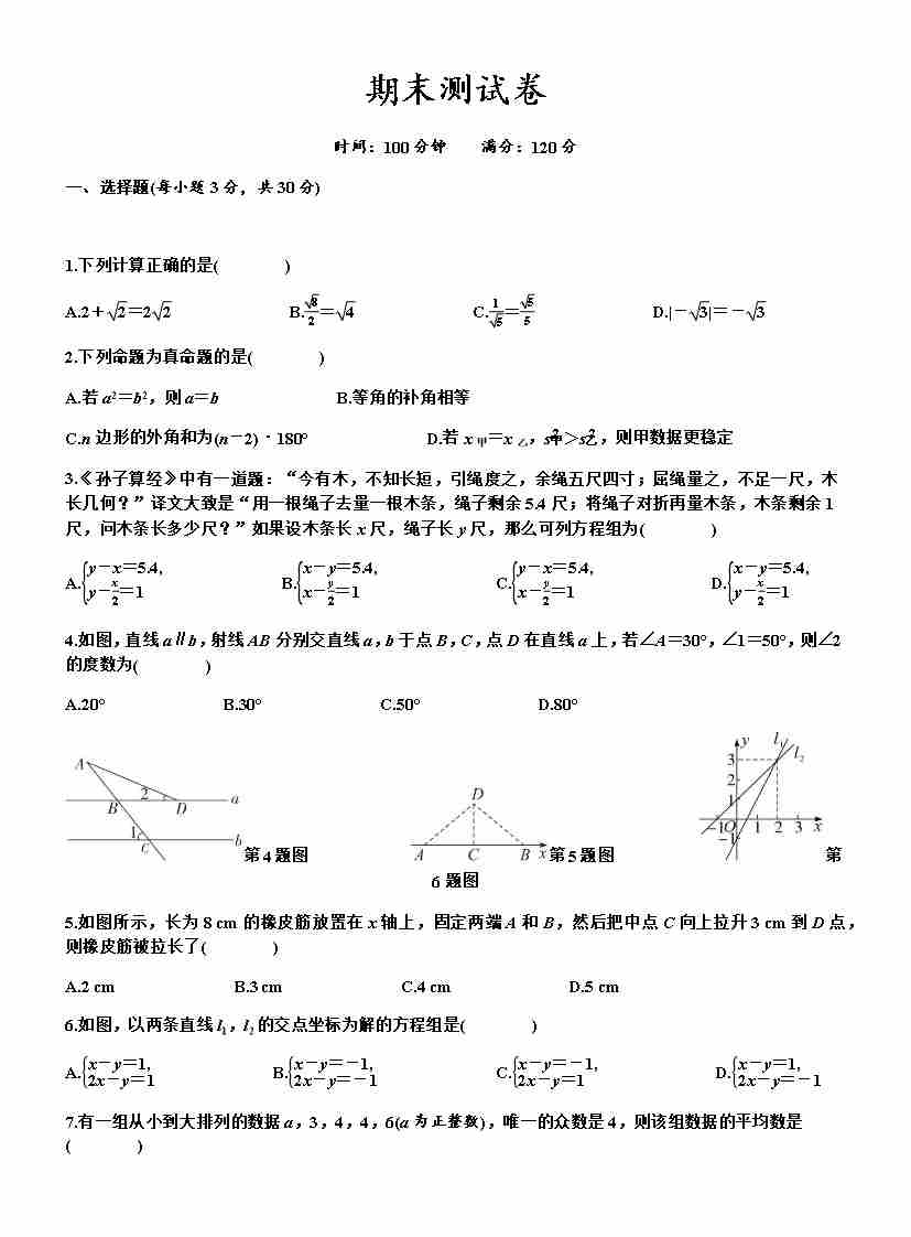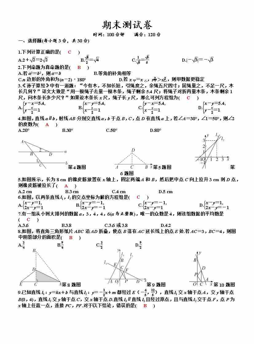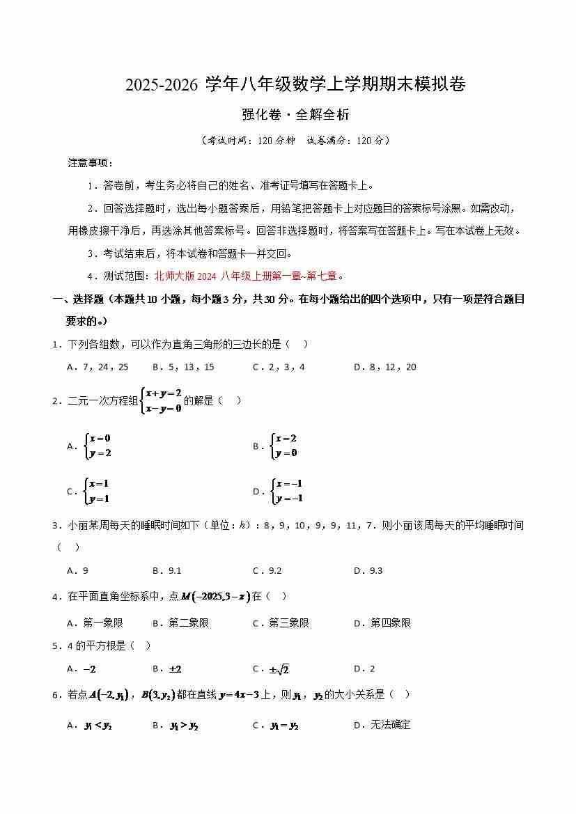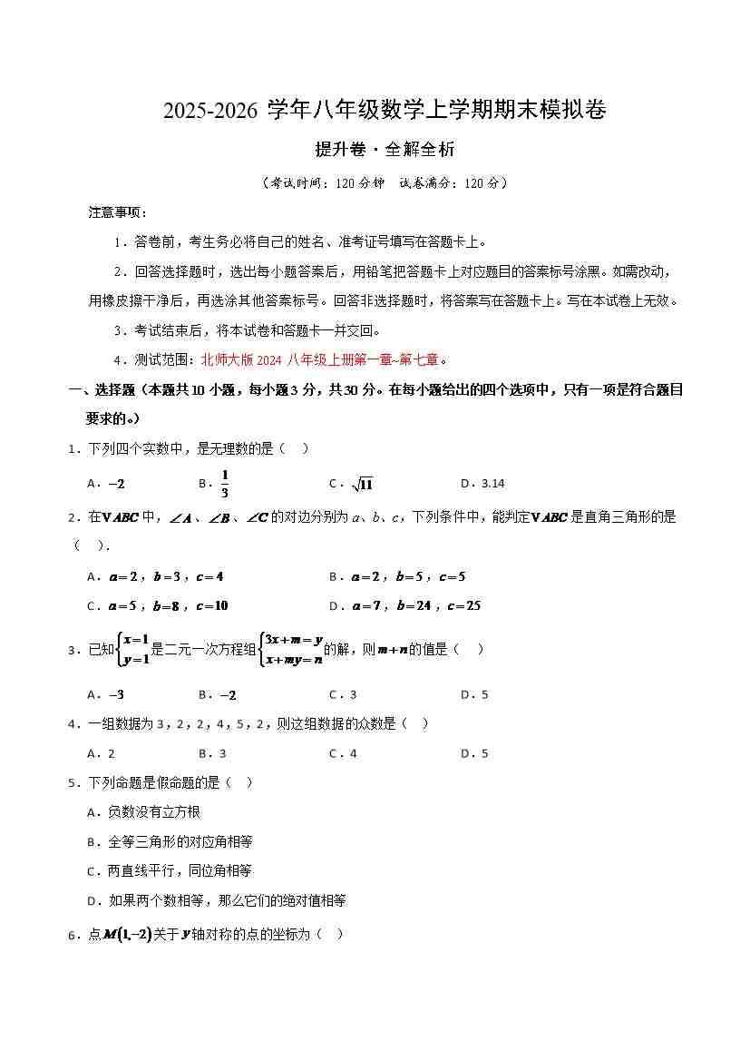 八年级数学上学期期末模拟卷·拔尖卷(北师大版,举一反三)(原卷版)