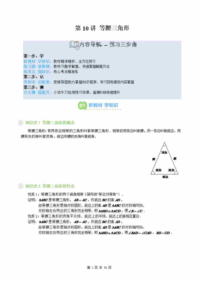 第10讲:等腰三角形(知识梳理+5课本习题典例11题型过关检测)(原卷版)