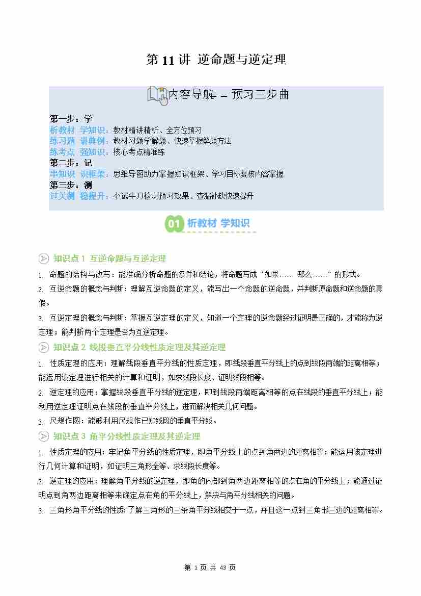 第11讲:逆命题与逆定理(知识梳理3课本习题典例8题型过关检测)(原卷版)
