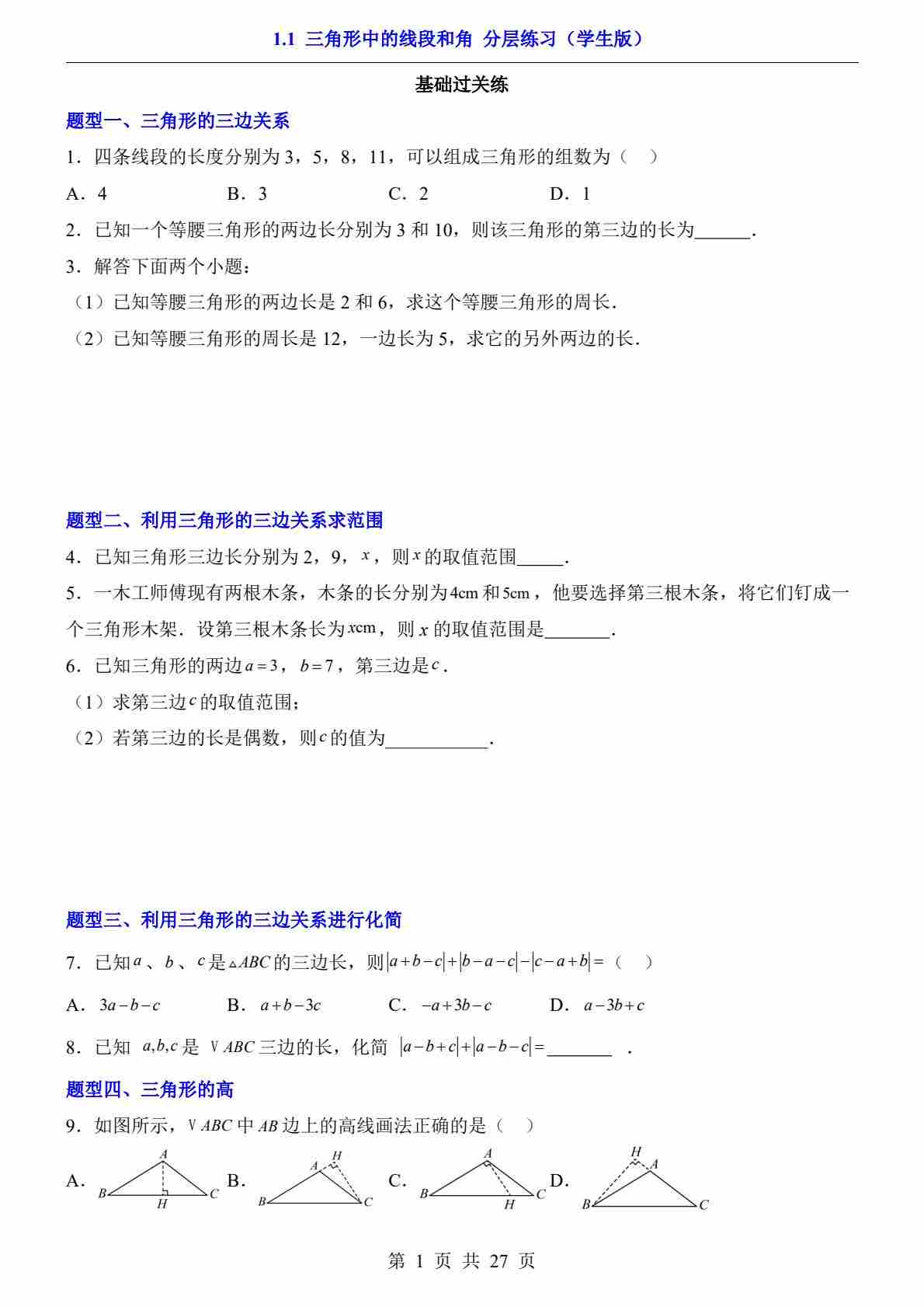 1.1 三角形中的线段和角(分层练习)