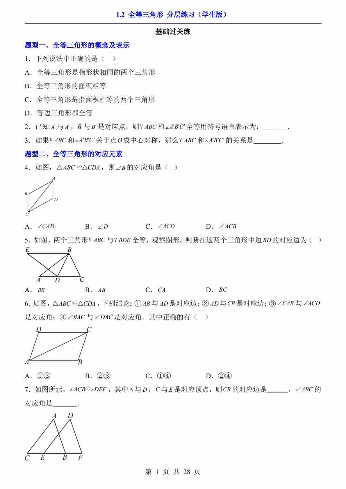 1.2 全等三角形(分层练习)