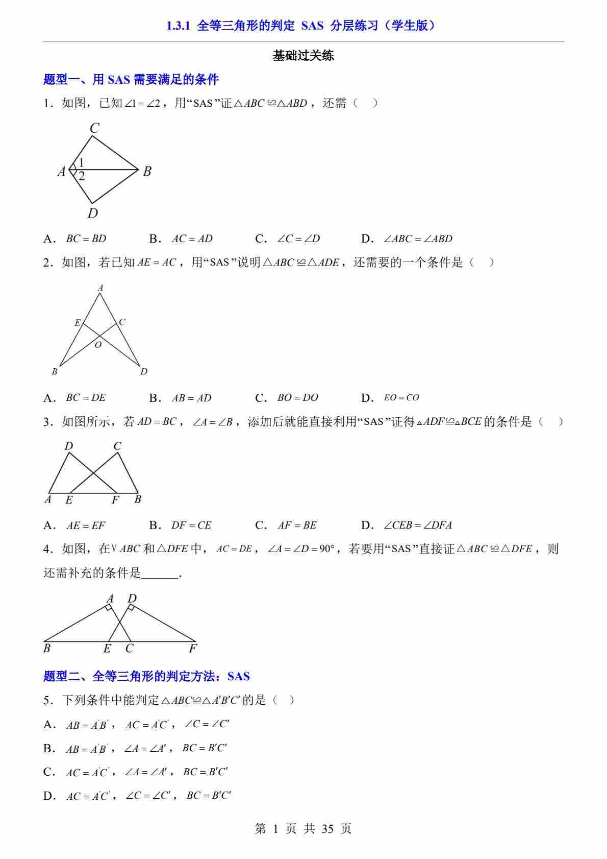 1.3.1 全等三角形的判定 SAS(分层练习)