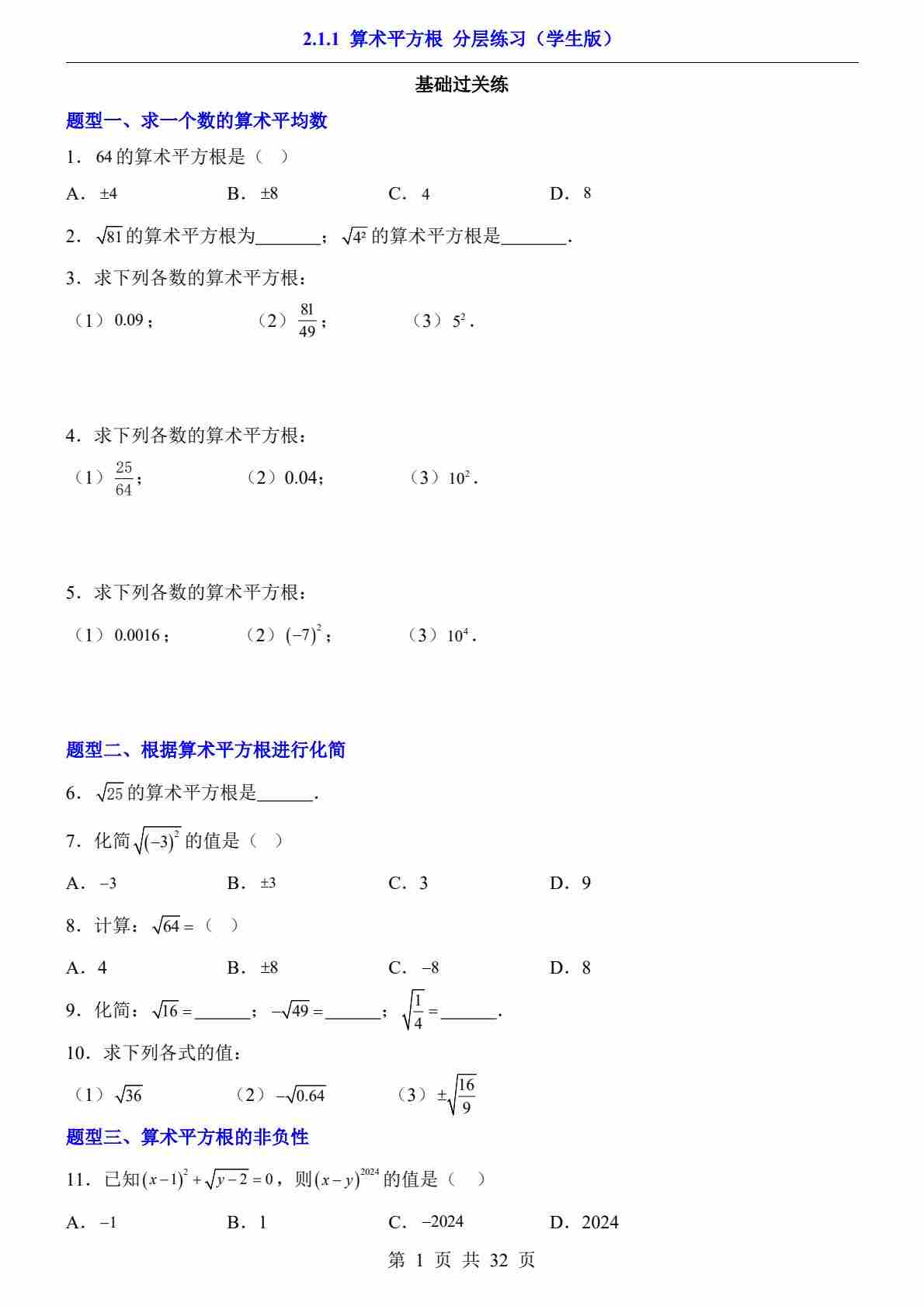 2.1.1 算术平方根(分层练习)