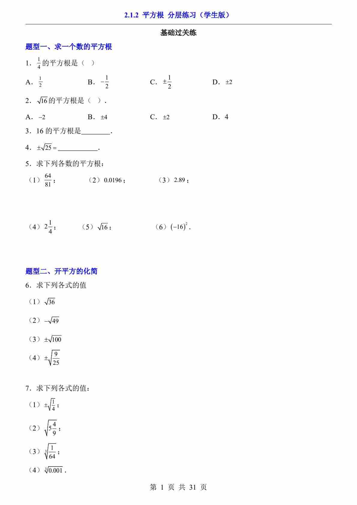 2.1.2 平方根(分层练习)