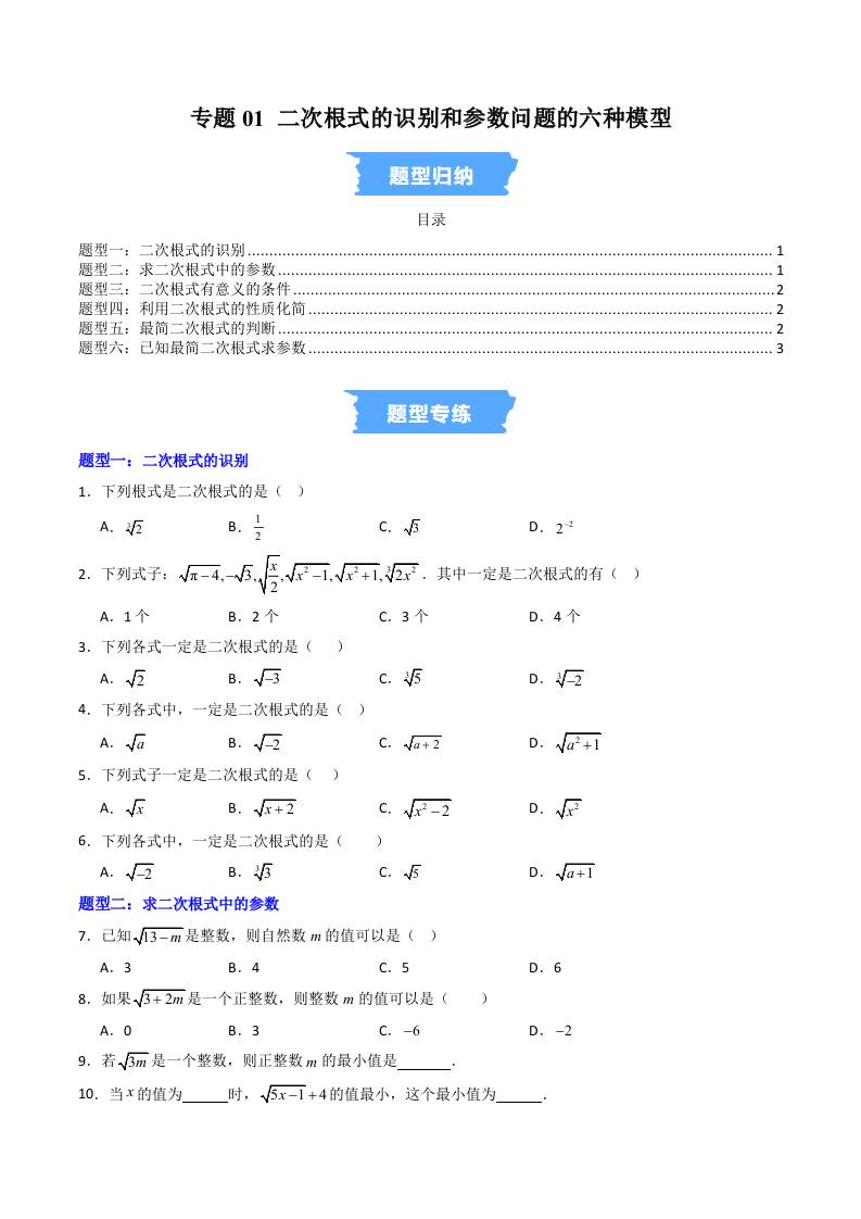 专题01 二次根式的识别和参数问题的六种模型(高效培优专项训练)(学生版)