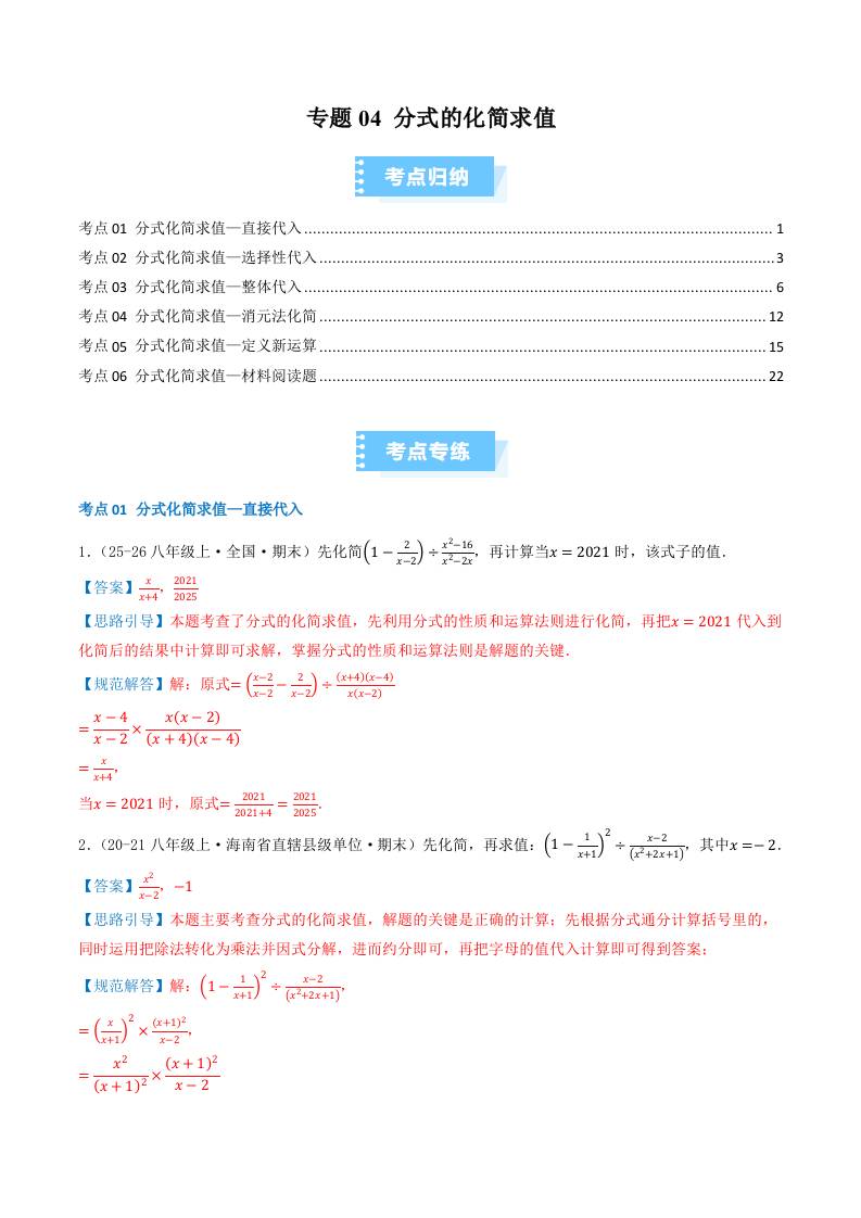 专题04 分式的化简求值(高效培优期中专项训练)(教师版)