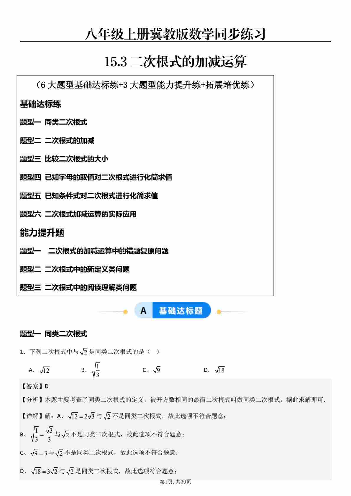 15.3二次根式的加减运算(题型专练)(原卷版)
