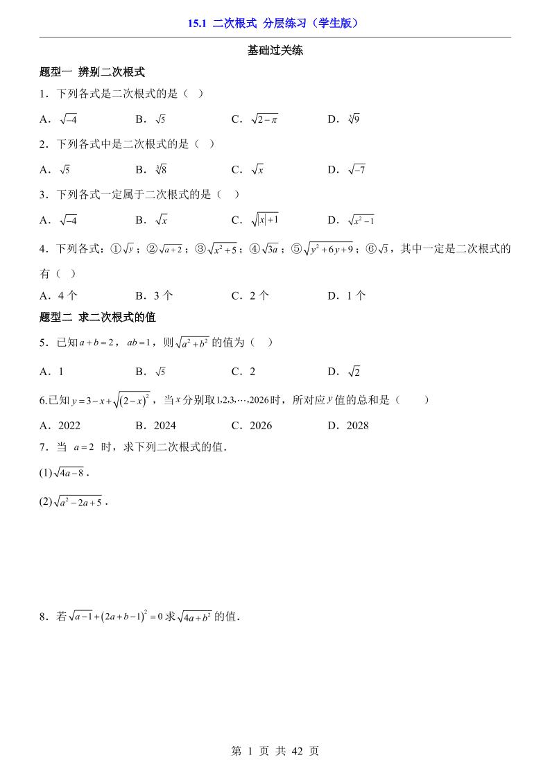 15.1 二次根式(分层练习)