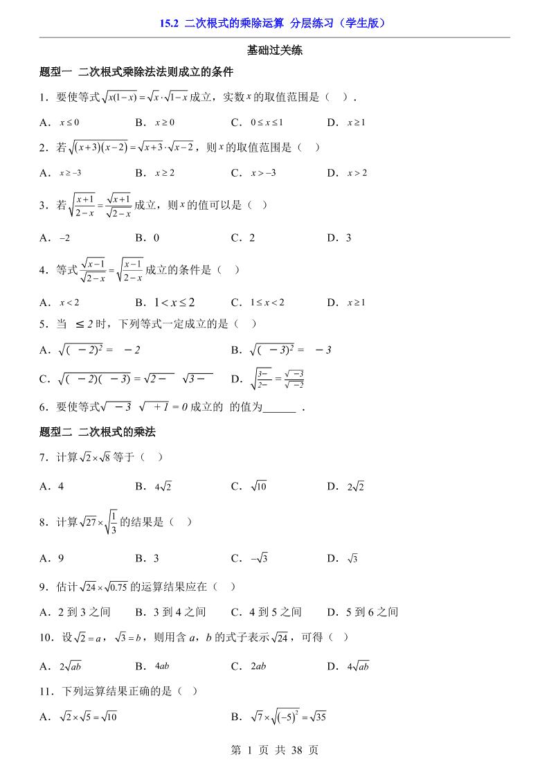 15.2 二次根式的乘除运算(分层练习)