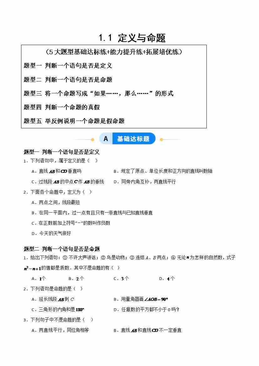 1.1定义与命题(题型专练)(原卷版)青岛版