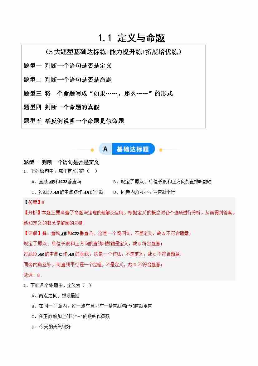 1.1定义与命题(题型专练)(解析版)青岛版