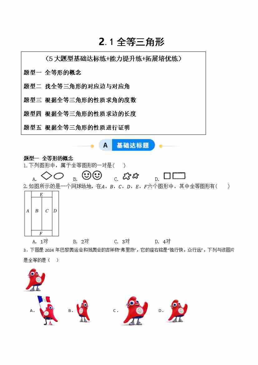 2.1全等三角形(题型专练)(原卷版)青岛版