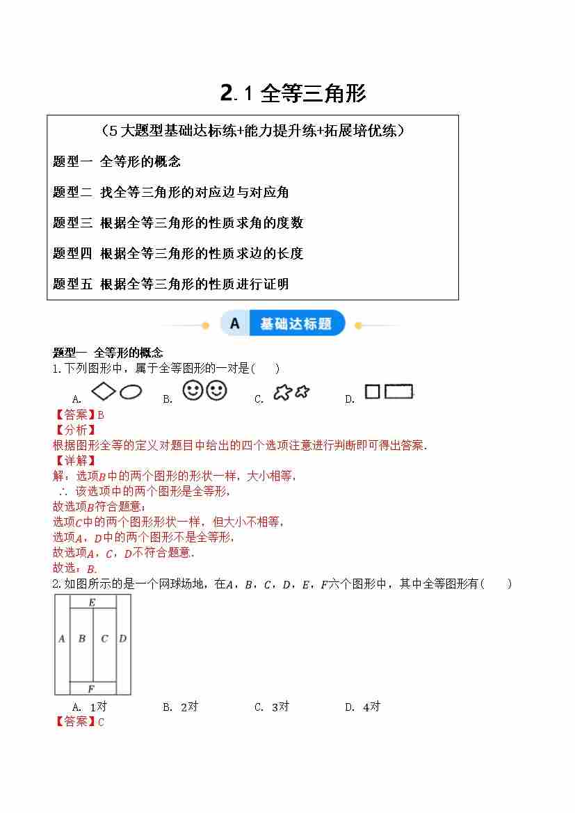 2.1全等三角形(题型专练)(解析版)青岛版
