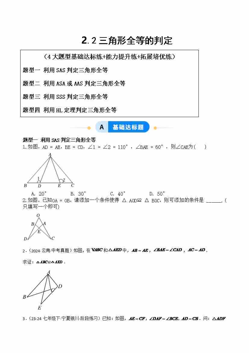 2.2三角形全等的判定(题型专练)(原卷版)青岛版