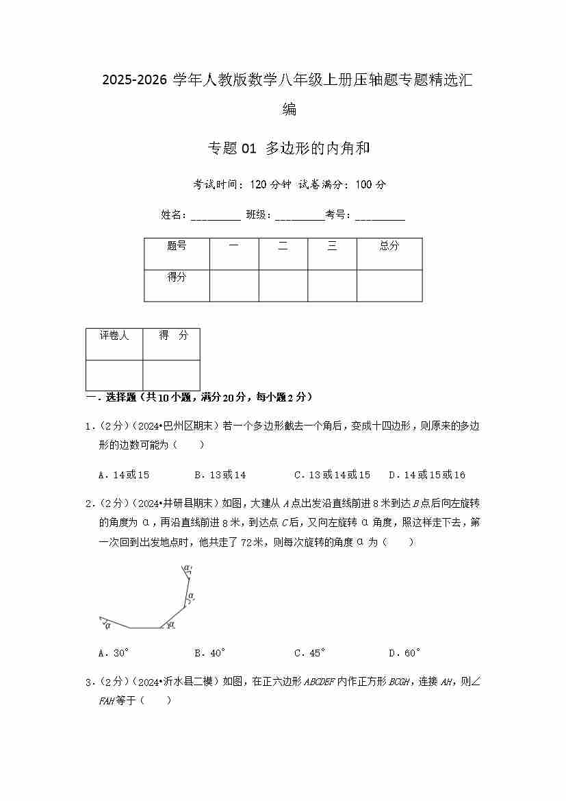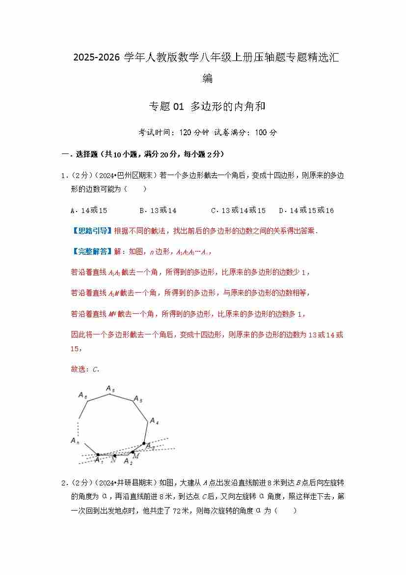 专题01 多边形的内角和(原卷版)