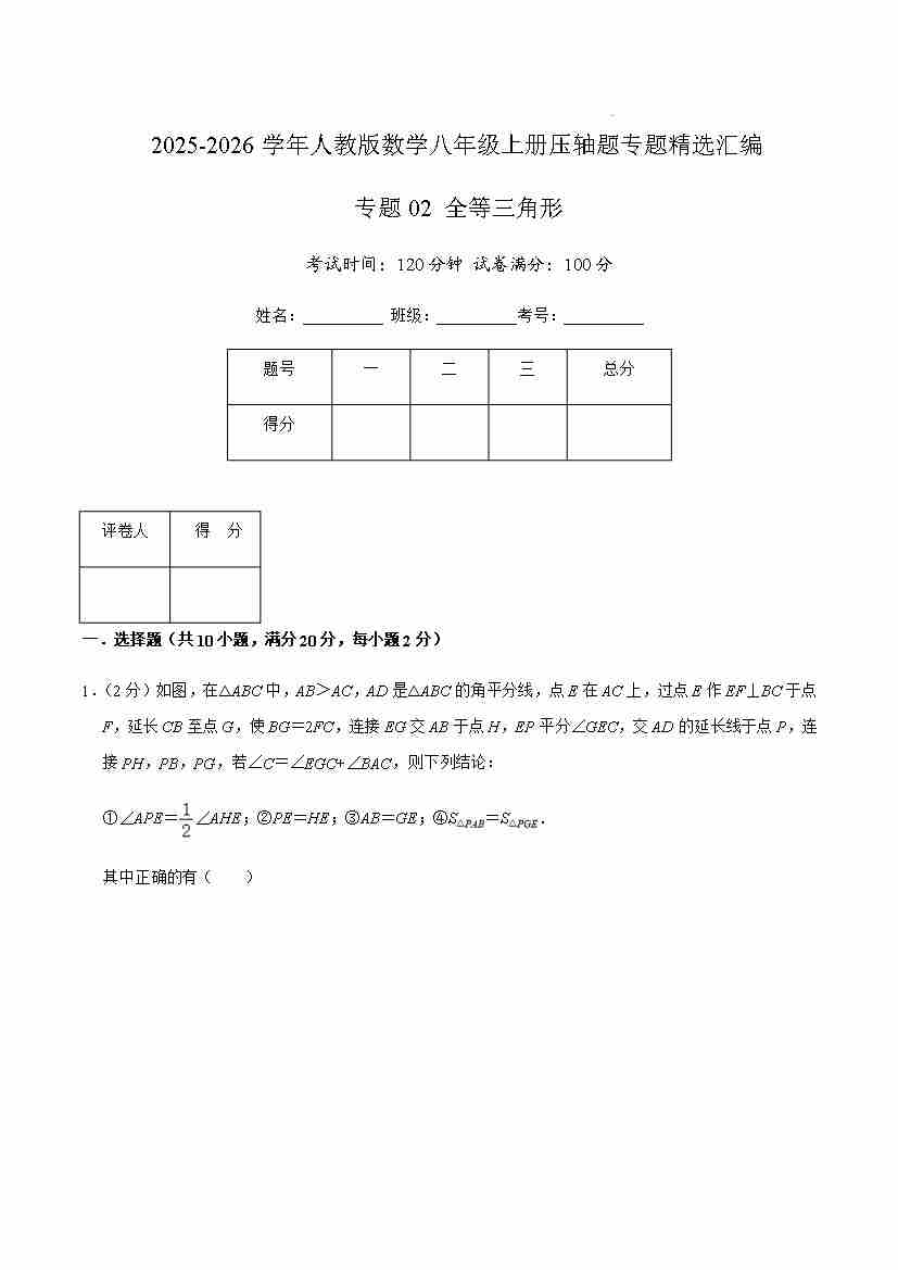 专题02 全等三角形(原卷版)
