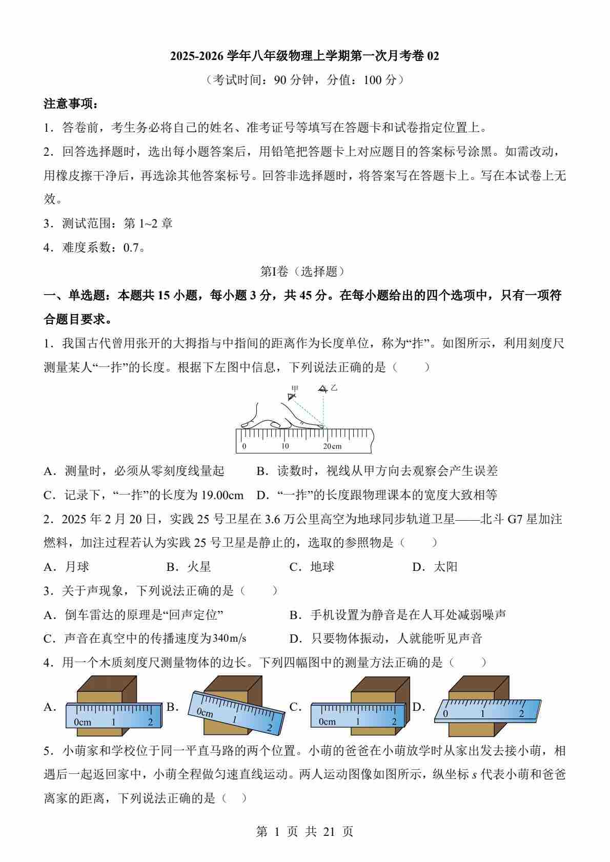 25秋【人教】8上物理第1次月考02【第1-2章】