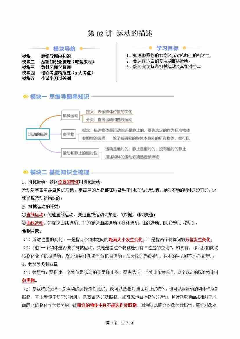 第02讲 运动的描述(原卷版)