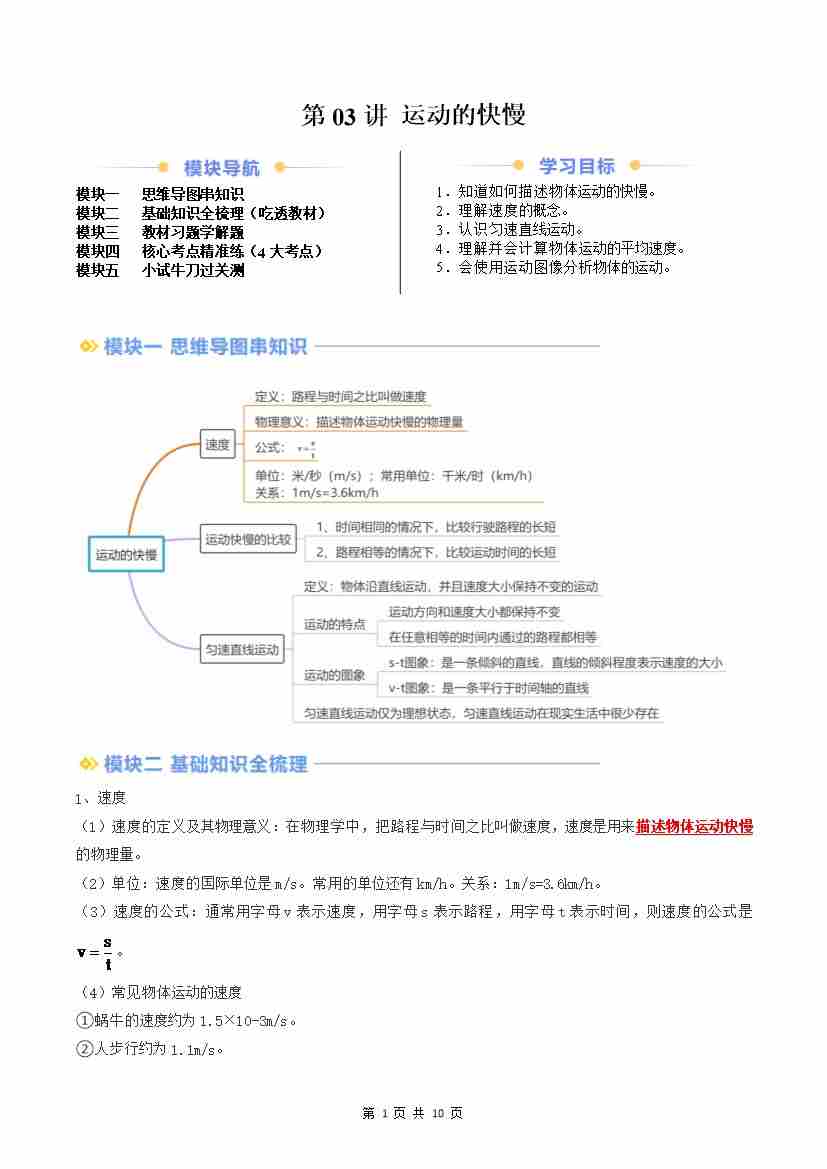 第03讲 运动的快慢(原卷版)