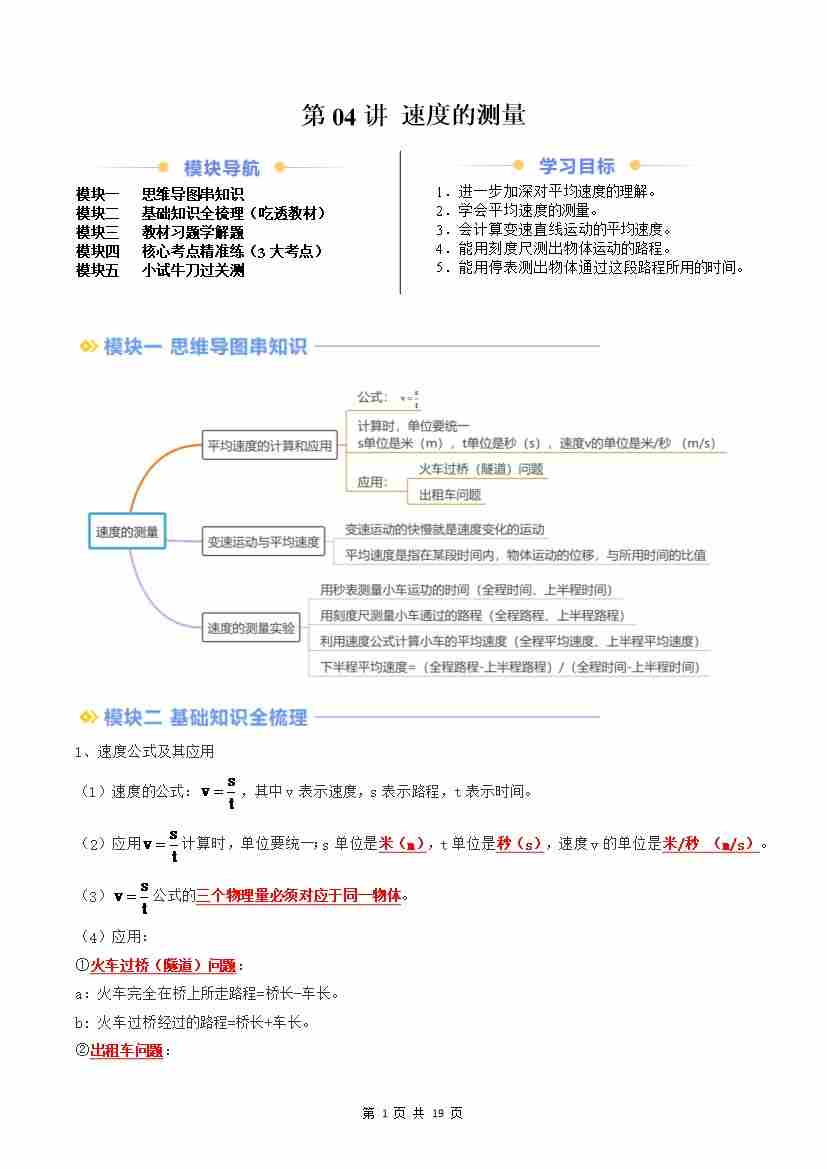 第04讲 速度的测量(原卷版)