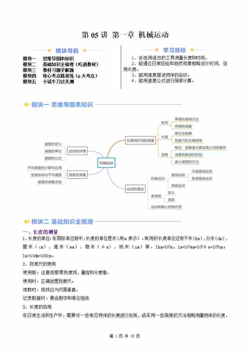 第05讲 第一章 机械运动(原卷版)