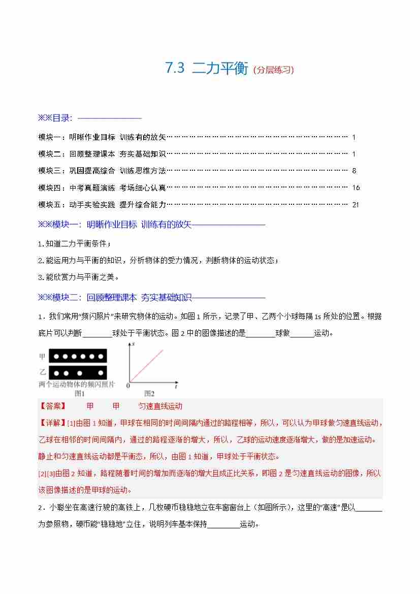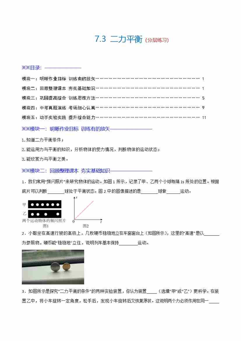 7.3 二力平衡(分层练习)-(沪科版2024)(原卷版)