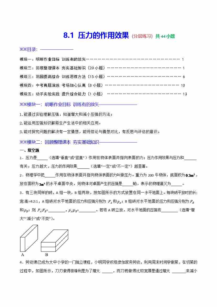 8.1 压力的作用效果(分层练习)-(沪科版2024)(原卷版)