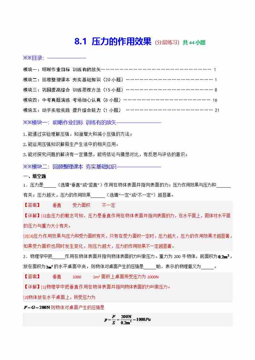 8.1 压力的作用效果(分层练习)-(沪科版2024)(解析版)