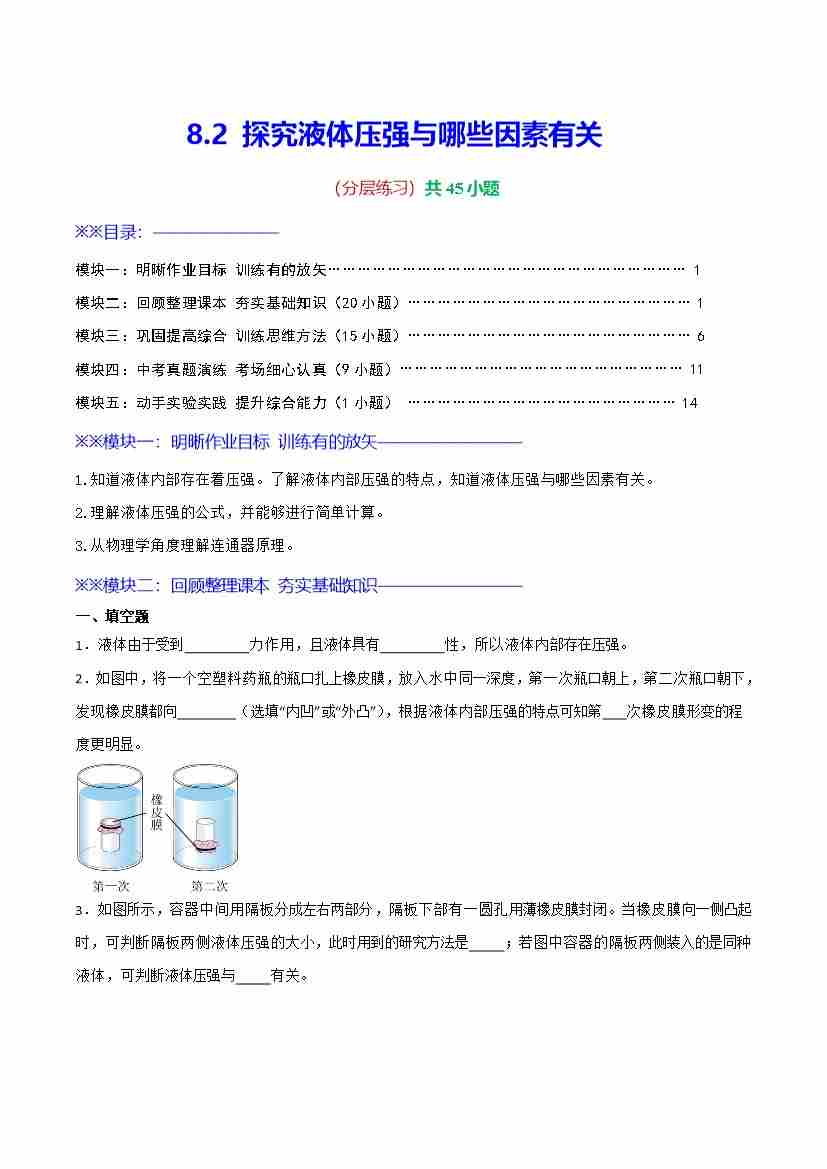 8.2 探究液体压强与哪些因素有关(分层练习)-(沪科版2024)(原卷版)