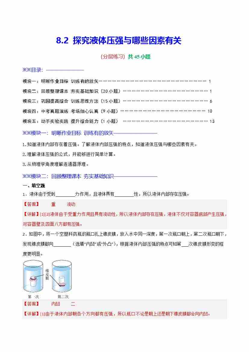 8.2 探究液体压强与哪些因素有关(分层练习)-(沪科版2024)(解析版)