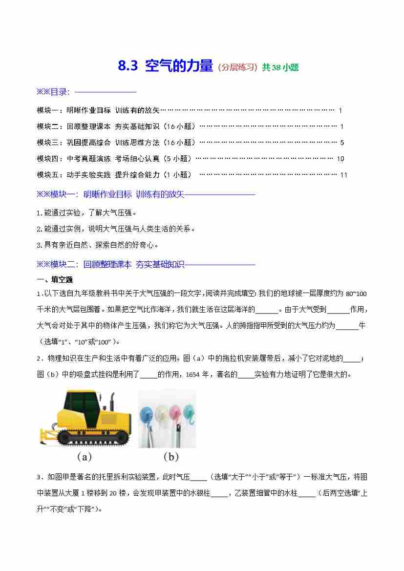 8.3 空气的力量(分层练习)-(沪科版2024)(原卷版)