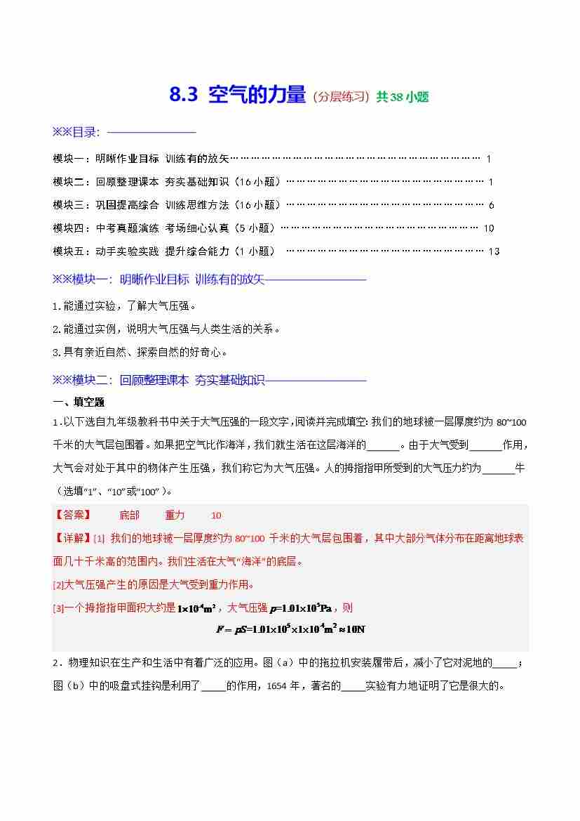 8.3 空气的力量(分层练习)-(沪科版2024)(解析版)