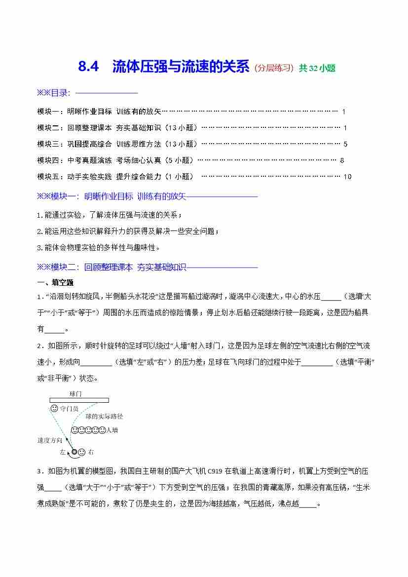 8.4 流体压强与流速的关系(分层练习)-(沪科版2024)(原卷版)