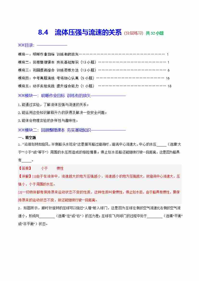 8.4 流体压强与流速的关系(分层练习)-(沪科版2024)(解析版)